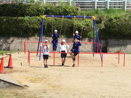 サッカーを楽しむ子、ブランコに乗る子など学年を超えて遊んでいます。