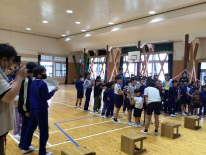 5/1 1年生を迎える会2 公開日 2025/05/01 更新日 2025/05/01 各学年から 次に4色遊びを行いました。 赤チームはクイズ、黄チームは進化ジャンケン、白チームはボール回し、青チームは玉入れの企画を6年生が考え、全校で楽しみました。
