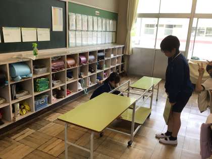 給食の準備や片付けがとてもスムーズにできています。「野菜もっと食べたいです」食欲も旺盛な子供たちです。