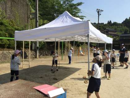 6時間目、4〜6年生がテントの設営、器具、運動場整備など、準備をしてくれました。