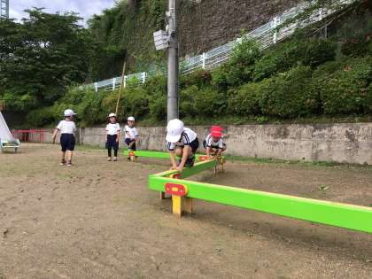 1年生は、平均台でネコ歩きの練習をしていました。バランスをとるのが難しそうで、何回も挑戦していました。