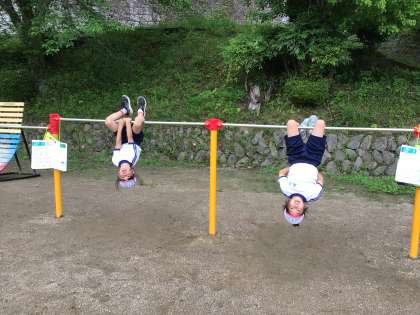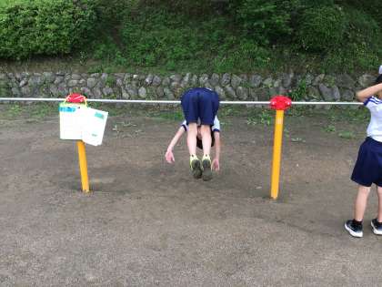 2年生は、鉄棒の技ができると、教科書にスタンプを押してもらっていました。「先生、見て」とあちこちから声が聞こえ、できる技を披露してくれました。2年生の教科書にのっている技を制覇する子も出てきそうです。