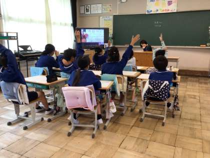 冷田小、則定小とキャンプ前にオンライン交流を行いました。自己紹介や学校紹介クイズを行い、親交を深めました。「よろしくお願いします」の声に、大きな声で答える姿が見られました。