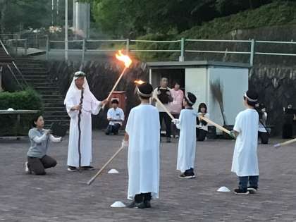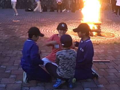 昨日行われたファイヤーの様子です。学校の代表として頑張る子、スタンツを協力して盛り上げている子等、慣れない環境で頑張る姿が見られました。足助小学校以外の子とも仲良くなっていて、たくさんの笑顔が見られました。