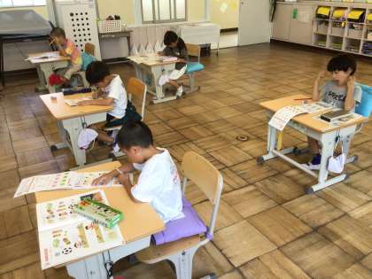 形の学習をしています。計算ドリルや算数の友の学習にも集中して取り組めています。
