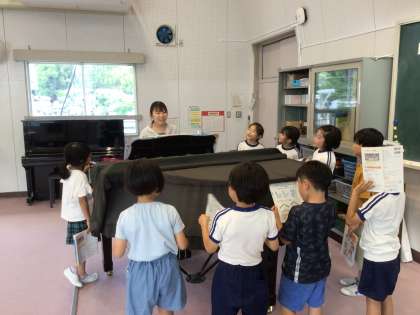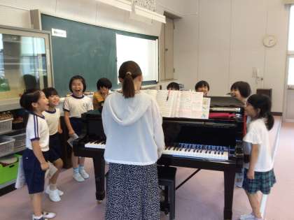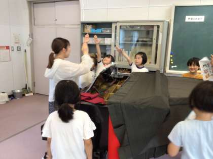 表現の仕方をみんなで話し合いながら、先生のピアノを囲んで、楽しそうに歌っていました。「怒っているカエル」「優しいカエル」など、工夫しながらいろいろなカエルの様子を表現していました。