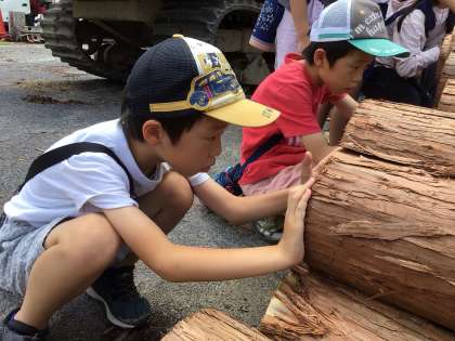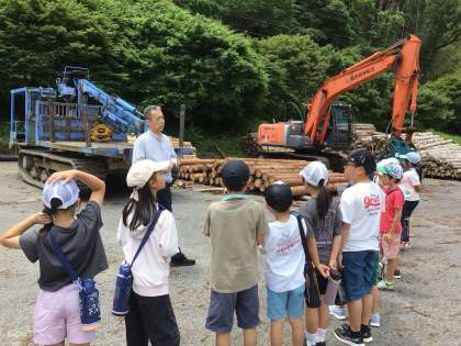 今日は、おいでんバスに乗って、森林組合へ見学に行きました。施設を見学したり、木を運ぶ重機に乗せてもらったりしました。見せていただいた資料もわかりやすく、木を切る上で気をつけていることや仕事のやりがいなど,子どもたちの疑問にも快く答えてくださり、子どもたちにとって学びの多い時間となりました。