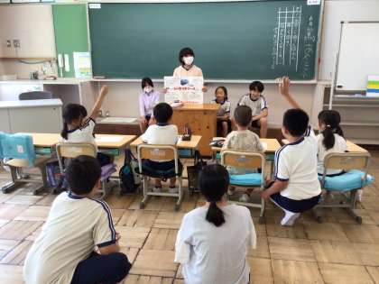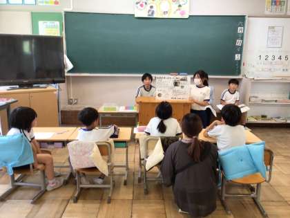 今年度から総合的な学習の時間の学びを他学年に伝えるあすっこペア活動の学習をスタートさせました。今日は、6年生が重伝建学習で学んできたことを、クイズ形式にしたり、写真や図を交えたりして、1・2年生にもわかりやすく伝えていました。