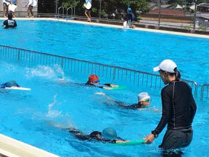 コースに分かれて、練習しています。バタ足やけのび、クロールの練習に取り組んでいます。