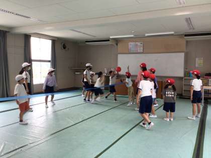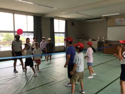 7/1 四色遊び 公開日 2025/07/01 更新日 2025/07/01 各学年から 青チームは、風船バレーをしました。ワークスペースをコートとして使い、低学年の子も風船を触れるように、協力して送っていました。