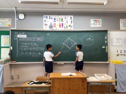 7/2 4年生 算数科「ひし形の特徴」 公開日 2025/07/02 更新日 2025/07/02 各学年から なぜひし形といえるか、説明する学習です。友達の説明を聞いて、さらに自分の言葉で説明していました。説明することで、理解が深まっています。