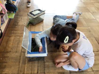 7/3 3年生「バッタに夢中」 公開日 2025/07/03 更新日 2025/07/03 各学年から 休み時間にバッタと遊ぶ3年生。「この子はいちごちゃん」「この子はミッチー」可愛がっているバッタを紹介してくれました。
