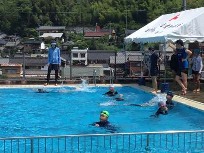 昨日は暑さのため、水泳は中止でしたが、今日は入ることができました。保護者ボランティアの方々が立ててくださったテントが大活躍しています。