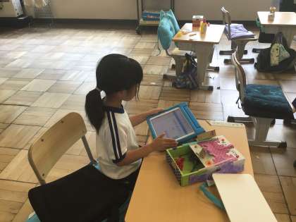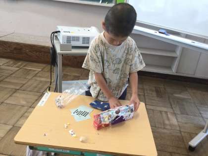 完成したボックスに、お宝を入れていました。学習用タブレットで写真を撮り,先生に提出することにも慣れてきました。