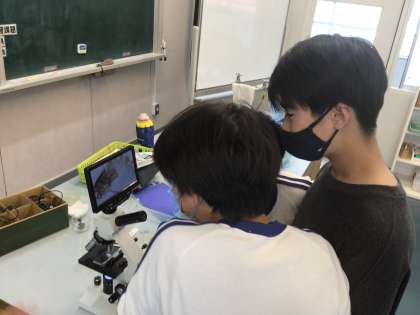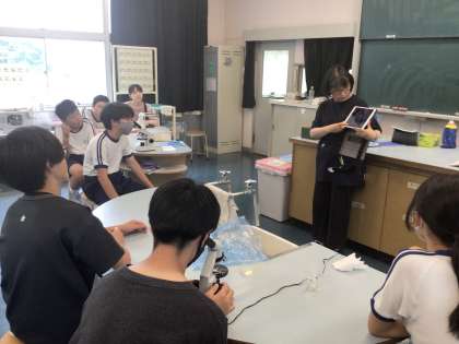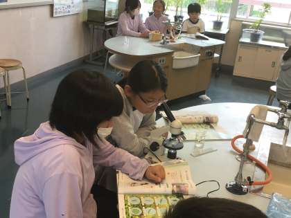 池の水をすくって、顕微鏡で観察しました。ケイソウやゾウリムシを見ることができたそうです。身の回りにいる生物が、何を食べているか興味深く観察していました。