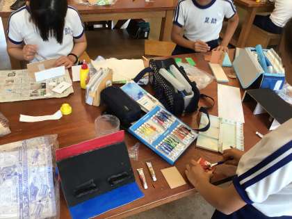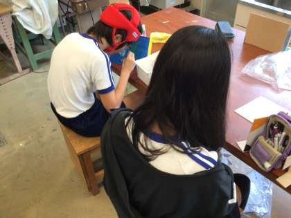 板に色を塗っています。 箱など、立体的な作品も出来上がってきていますね。
