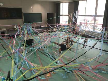 ワークスペースがタフロープでいっぱいになりました。ひもを結ぶ練習をして、ひもをつなげることで別世界ができ、その様子を楽しみました。