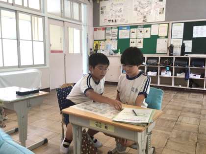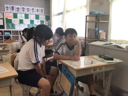 すごろくゲームで、自分の生活に関わる時間の言い方を練習しました。ペアでお互いのことを聞き合い、初めて知る友達の情報に驚いている子もいました。