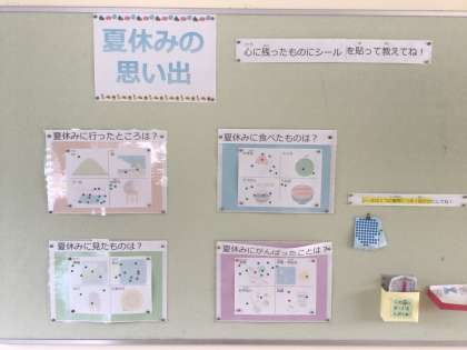 昇降口に、夏休みの思い出や9月からがんばりたいことの掲示物が貼ってあります。掲示物を見ると、プールに行った子が多かったようです。また、勉強を頑張ろうという決意を書いてくれている子も多いですね。