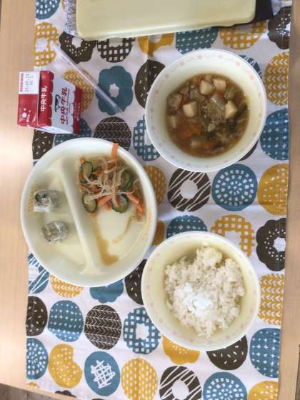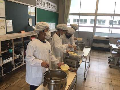 エプロンの着方も配膳の手際良さも抜群の四年生。今日のメニューは、ごはん、しゅうまい、豆腐の中華煮、ナムルと牛乳です。「お腹すいた」とみんな給食を楽しみにしていました。