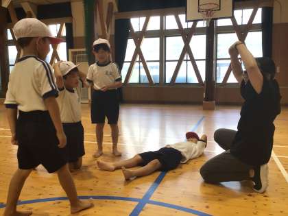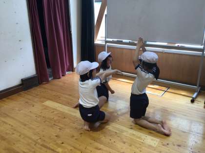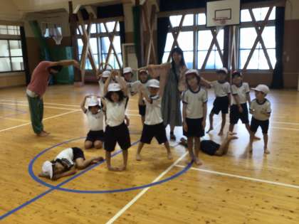最初のお題から、イメージをどんどん広げて、身体で表現しています。グループによって、広がり方が違い、子どもたちも楽しそうです。