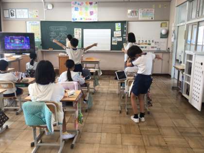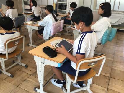 学習用タブレットを使って、自分で調べながら、プレゼン作りを行っています。