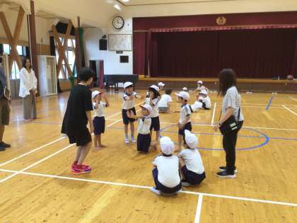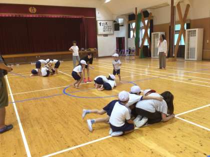 今日が最後の授業です。みんなで協力して、車などのお題を身体で表現したり、アイコンタクトで気持ちを送り合ったりしました。