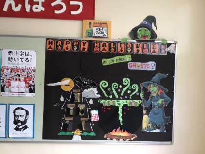 また、ALTのカルメラ先生もハロウィンのすてきな掲示を作ってくれました。