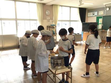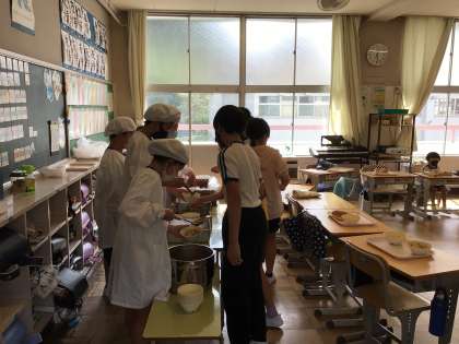 公務手さんにもお願いして、お盆を全員分準備していただき、各教室で配膳をして、それぞれの教室へ向かいました。6年生や運営委員会の子たちが、他教室から机を移動させたり、会話が弾むようクイズを準備したり、たくさんの支えがあってあすっこランチタイムが実現しました。