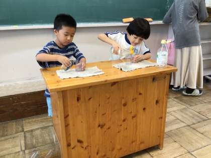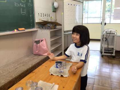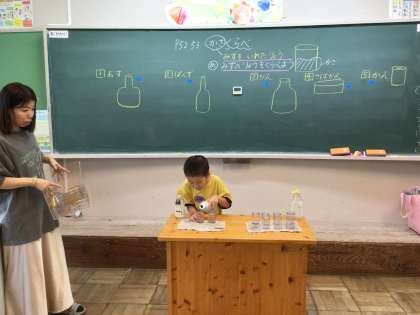 最初に予想をし、実際に水を入れて確かめる学習に、子どもたちの目が輝いていました。