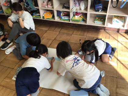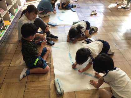 大きな模造紙に足助の町並の地図を1から作り始めていました。足助の美しい川を色鉛筆で塗るのも楽しそうです。