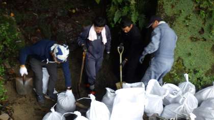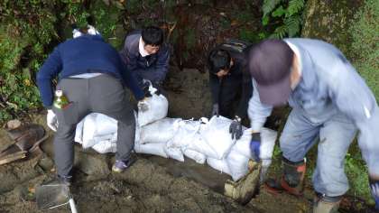 鯉の池の水をひいている側溝が泥で詰まってしまったため、PTA役員3名の方が、校内整備員と足助グランドで作業をしてくださいました。普段は、池の水が出てこない時に、校内整備員が一人で作業を行っているのですが、泥で側溝が詰まるのを防ぐための土のう作りと積む作業に協力してくださり、本当に助かりました。