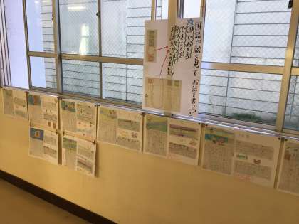 教室の前には、国語科で作ったお話の続きや図画工作科で描いた絵など、学習の足跡が残されています。