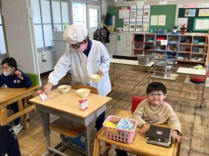 それぞれが自分のできることに取り組んでいました。配膳をする子、ストローを配る子など、協力して給食の準備を進めています。