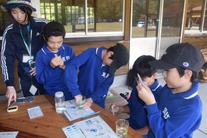 地域講師の先生にご協力をいただき、御内地区の水質調査に行きました。水の透明度を測ったり、パックテストを行ったりした結果、後川と神越川の水はとてもきれいだと分かりました。また、子どもたちは、足助川と比べると、においもしないことに気付きました。さらに、足助地区は後川浄水場の水を飲んでいることも教えていただき、大変充実した1日になりました。