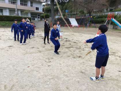 12月に行われる4色対抗8の字跳び大会に向けて,練習が始まりました。6年生はいち早く運動場にでて、コーンや長縄の準備をしてくれていました。どのチームも6年生が中心となって、練習を進めていて、運動場には勇気を出して跳ぼうと頑張る姿が見られました。