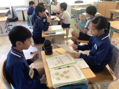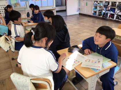 アルファベットを使った好きな色クイズを行いました。「Do you have ”e”? など色に含まれる綴りをヒントに、相手の好きな色を考えました。当たった時は満面の笑顔が見られました。