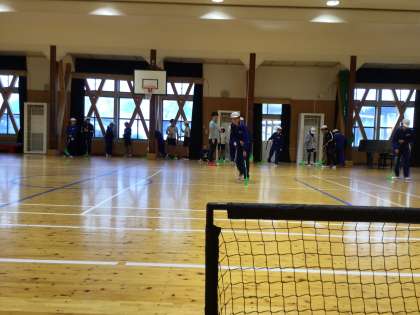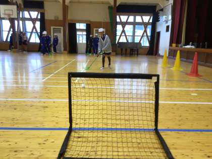 高学年はユニファイドスクールという出前講座をお願いし、フロアボールを行っています。スティックを使ってプラスチック製のボールを相手チームのゴールに入れて得点を競う、室内で行う団体球技です。ボールが思うように転がらないようですが、シュート練習を楽しんでいました。