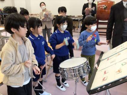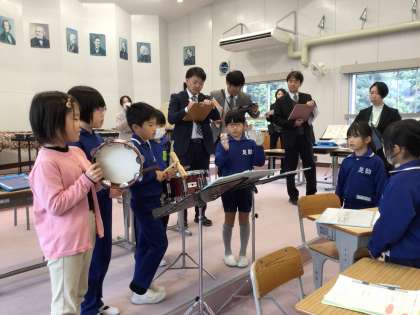 講師の先生をお招きし、音楽科の授業を見ていただきました。自分たちの思いに合う表現をするために、音を言葉で表現しながら話し合う姿があちこちで見られました。