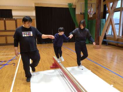 今日は、平均台・ラダー走り・輪っかジャンプなどを組み合わせたサーキットトレーニングを行いました。サーキット形式にすることで、楽しみながら体力づくりを行っています。このような活動を通して、体の使い方だけでなく「やってみよう」「できた!」という達成感を積み重ね、自信や意欲につなげています。