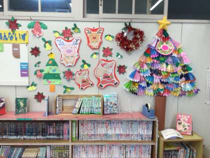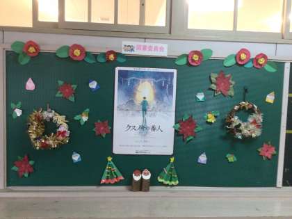 図書室ボランティアの方に、図書室の飾り付けをしていただきました。クリスマスの雰囲気いっぱいのかわいらしい掲示が壁面を彩っています。