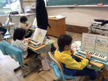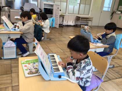 今年度より、鍵盤ハーモニカを再開しました。今日は「ド・レ・ミ・ファ・ソ」までの音を指で確かめながら、曲「ひのまる」に挑戦しました。鍵盤ハーモニカを演奏するために息を使うことで、呼吸のコントロールが身につき、体力づくりにもつながるそうです。