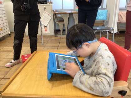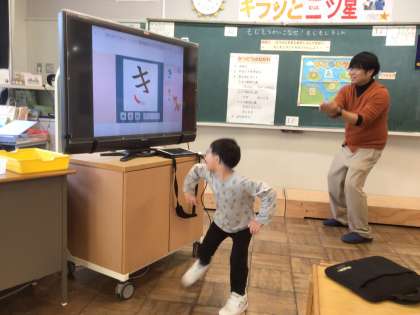 楽しみながら文字に親しめるように「もじもじランドの冒険」という設定で、ひらがなの学習を進めました。文字の形を体で表現したり、ICTを活用したり、パズルで文字の形合わせやなぞり書きを行ったり、遊び感覚で学べる工夫がありました。