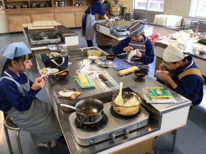 調理実習でご飯と味噌汁を作りました。味噌汁には、油あげ、大根、ネギを入れました。みんなで協力して材料を切ったり、火加減を調整したりしながら、美味しいご飯と味噌汁を完成させることができました。自分たちで作った料理は、いつもよりもっと美味しく感じたようです。