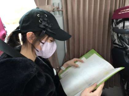 早起きをしたからか、寝ている子が多くいます。修学旅行のしおりをチェックしている子もいます。