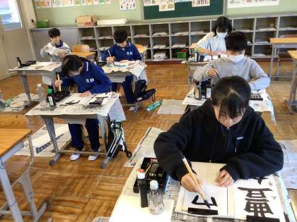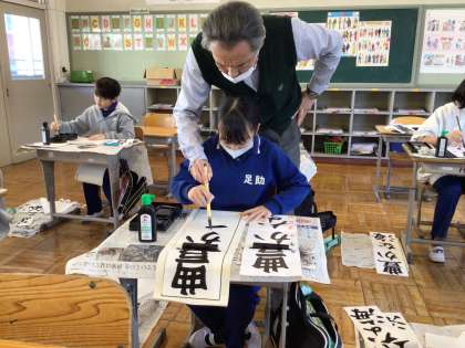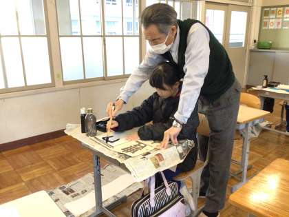 書写ボランティア 加藤矢舟先生が書き初めの指導をしてくださいました。筆の運び方、名前を書く位置なども教えていただきました。子どもたちは、手本をしっかり見ながら、真剣に筆を運び、思うような字が書けた時は、とても嬉しそうでした。