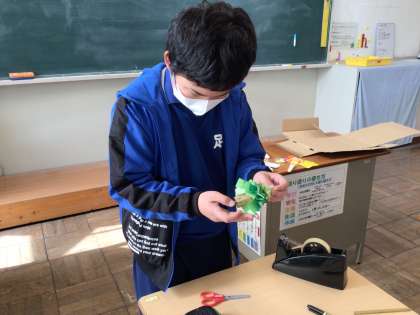 クリスマスツリー作りでは、画用紙を丁寧に折って形を作り、思い思いに飾りつけをしました。