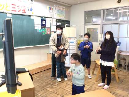 特別支援学級の壁にはかわいらしい飾りがあり、廊下にはクリスマスツリーの掲示が飾られています。朝の会で、子どもたちは12月の歌「ジングルベル」を、楽器を演奏しながら歌っていました。