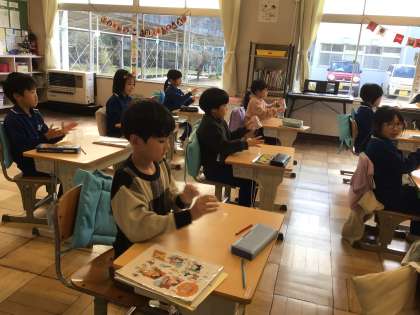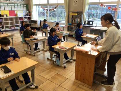 机を手でたたいたり、カップを使って音を出したりと、リズムに合わせて体を動かします。最初は難しそうにしていた子どもたちも、音や動きをよく見て、だんだんとタイミングを合わせられるようになってきました。複雑な動きにも一生懸命ついていこうとする姿がとても頼もしく、教室には元気な音と笑顔があふれていました。