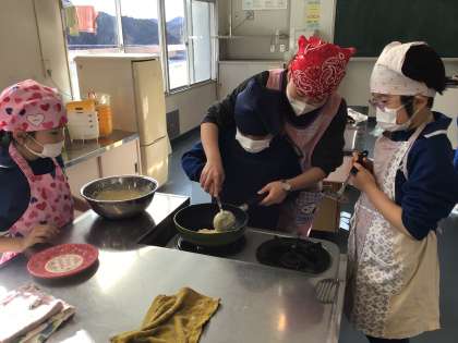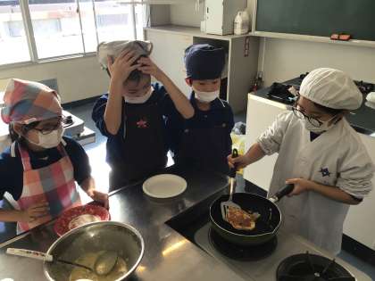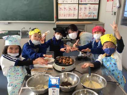 さつまいもを使ったお菓子作りをしました。1年生は、たこ焼き器を囲んで、生地をひっくり返すのに苦戦中でした。2年生は、フライパンでさつまいもホットケーキを協力しながら作っていました。家庭科室はおいしそうな匂いが漂っていました。